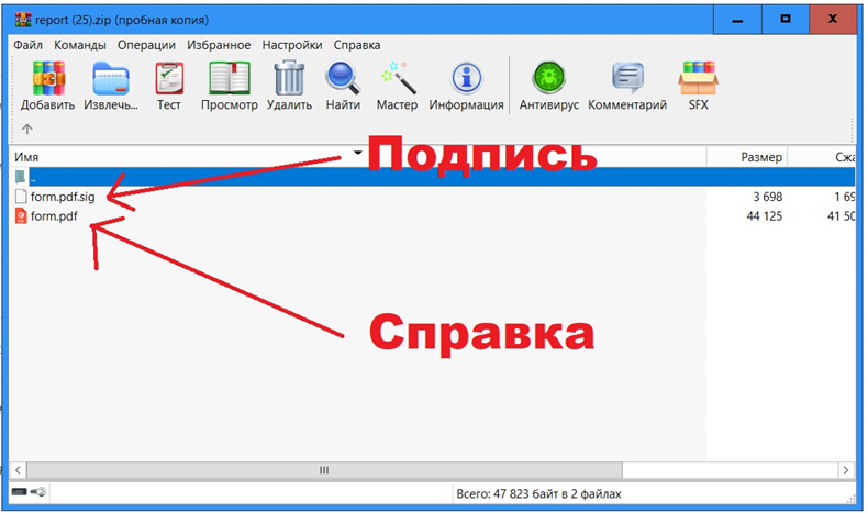 Шаг 6. Архивная справка Ф.9 в электронном виде, подписанная усиленной квалифицированной электронной подписью (form.pdf) вместе с файлом электронной подписи (form.pdf.sig) будет сформирована в режиме онлайн в архивированном виде