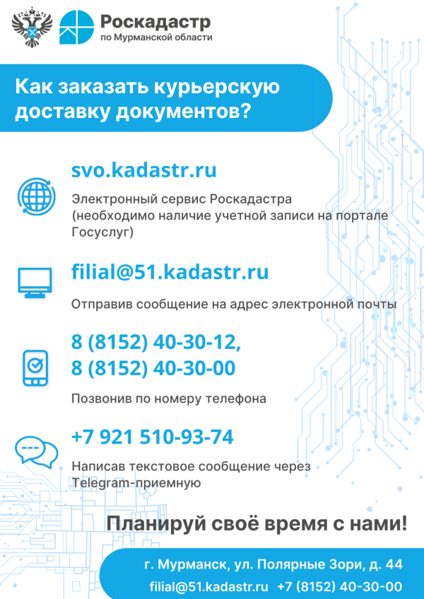 1. По месту хранения документов в офисах ППК «Роскадастр» по Мурманской области (по заявлению документы будут выданы в день обращения, бесплатно).