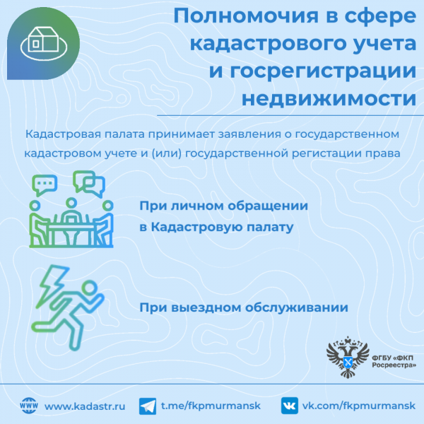 Полномочия в сфере ГКУ и (или) ГРП на недвижимость. Кадастровая палата принимает заявления о ГКУ и (или) ГРП при личном обращении заявителя, либо при оказании услуг по выездному обслуживанию.