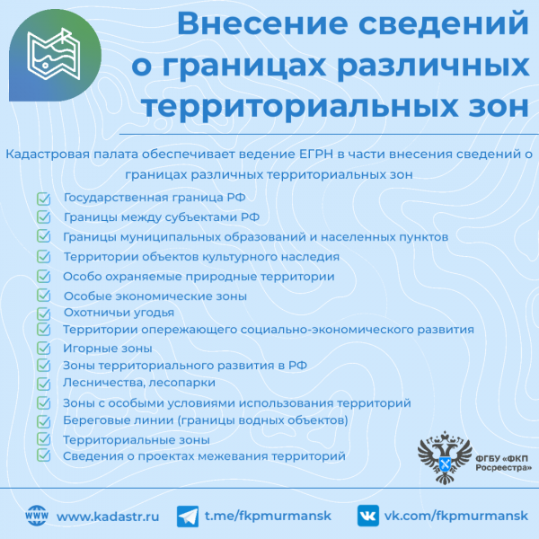 Внесение сведений о границах различных территориальных зон. Кадастровая палата обеспечивает ведение ЕГРН в части внесения сведений о границах зон с особыми условиями использования территорий, территориальных зон, территорий объектов культурного наследия, особо охраняемых природных территорий, особых экономических зон, охотничьих угодий, территорий опережающего социально-экономического развития, зон территориального развития в РФ, игорных зон, лесничеств, лесопарков, о Государственной границе РФ, границах между субъектами РФ, границ муниципальных образований и населенных пунктов, о береговых линиях (границах водных объектов), сведений о проектах межевания территорий.