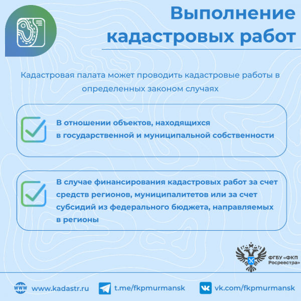 Выполнение кадастровых работ. Кадастровая палата может проводить кадастровые работы в отношении объектов, находящихся в государственной и муниципальной собственности. Работа по постановке их на кадастровый учет ведется ради наполнения ЕГРН полными и точными сведениями.