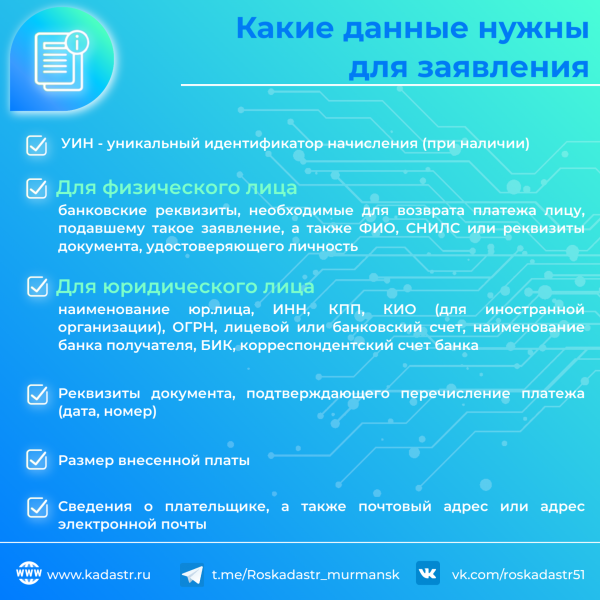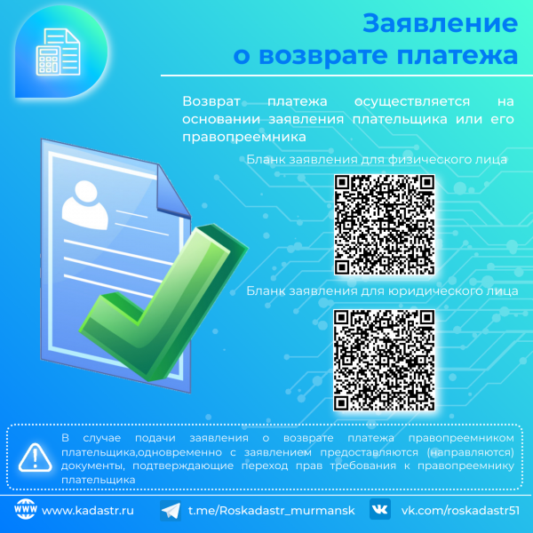 Оформить возврат может лицо, подавшее запрос на предоставление сведений, а также его представитель по доверенности. В случае подачи заявления о возврате платежа правопреемником плательщика одновременно с заявлением представляются (направляются) документы, подтверждающие переход прав требования к правопреемнику плательщика.