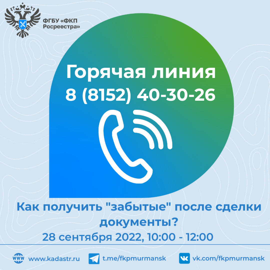 28 сентября 2022 года с 10:00 до 12:00 в Кадастровой палате по Мурманской области пройдет горячая линия, посвященная вопросам получения невостребованных документов...