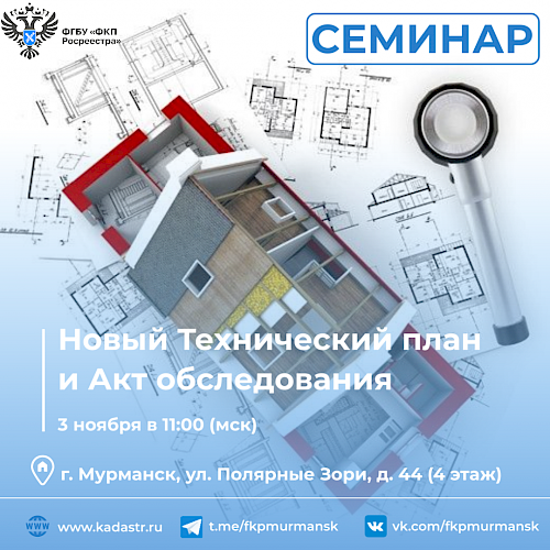 Кадастровая палата по Мурманской области проведет семинар для кадастровых инженеров по теме «Новый Технический план и Акт обследования». Мероприятие состоится 03 ноября в 11:00 (мск) по адресу: г. Мурманск, ул. Полярные Зори, д. 44, а также в онлайн-формате.