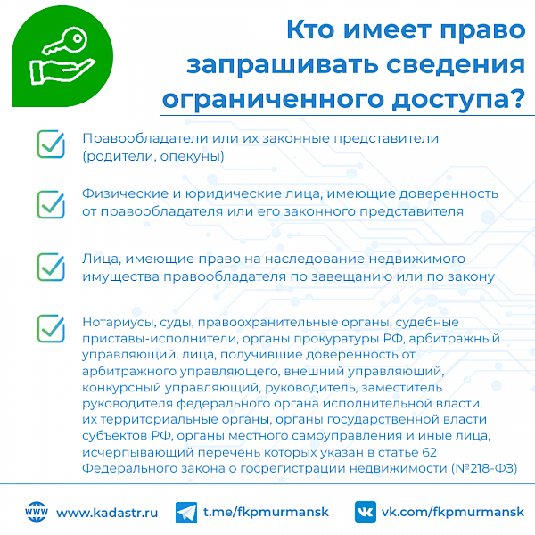 Согласно статье 62 Федерального закона от 13.07.2015 №218-ФЗ «О государственной регистрации недвижимости», к лицам, имеющим право получения сведений ограниченного доступа, относятся правообладатели или их законные представители (родители, опекуны), физические и юридические лица, имеющие доверенность от правообладателя или его законного представителя, лица, имеющие право на наследование недвижимого имущества правообладателя по завещанию или по закону и иные лица, перечисленные в законе.