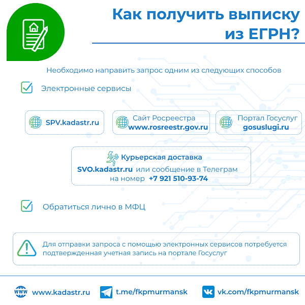Напомним, что выписку из ЕГРН можно получить, воспользовавшись электронными сервисами (потребуется подтвержденная учетная запись на портале Госуслуг):